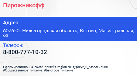 Пирожникофф по адресу 607650, Нижегородская область, Кстово, Магистральная, 6а в дальнейшем Организация, размещена в следующих категориях: