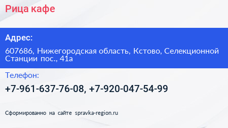 Рица, кафе по адресу 607686, Нижегородская область, Кстово, Селекционной Станции пос., 41а в дальнейшем Организация, размещена в следующих категориях: