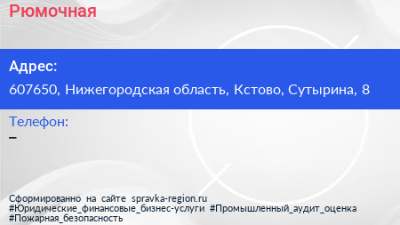 Рюмочная по адресу 607650, Нижегородская область, Кстово, Сутырина, 8 в дальнейшем Организация, размещена в следующих категориях: