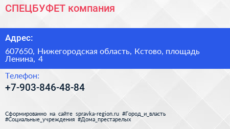 СПЕЦБУФЕТ, компания по адресу 607650, Нижегородская область, Кстово, площадь Ленина, 4 в дальнейшем Организация, размещена в следующих категориях: