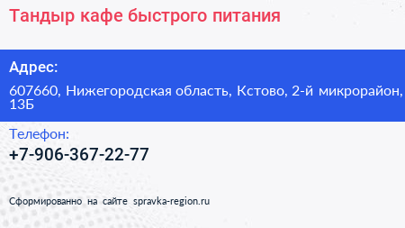 Тандыр, кафе быстрого питания по адресу 607660, Нижегородская область, Кстово, 2-й микрорайон, 13Б в дальнейшем Организация, размещена в следующих категориях: