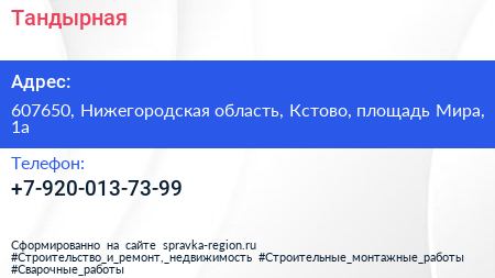 Тандырная по адресу 607650, Нижегородская область, Кстово, площадь Мира, 1а в дальнейшем Организация, размещена в следующих категориях: