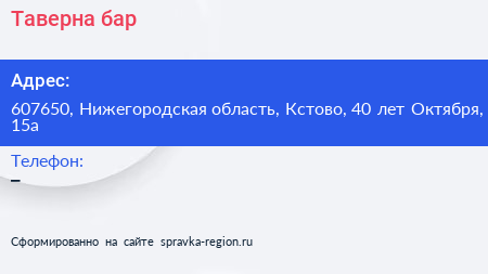 Таверна, бар по адресу 607650, Нижегородская область, Кстово, 40 лет Октября, 15а в дальнейшем Организация, размещена в следующих категориях: