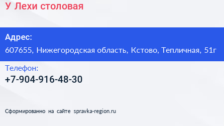 У Лехи, столовая по адресу 607655, Нижегородская область, Кстово, Тепличная, 51г в дальнейшем Организация, размещена в следующих категориях:
