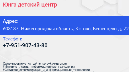 Юнга, детский центр по адресу 603137, Нижегородская область, Кстово, Бешенцево д, 72 в дальнейшем Организация, размещена в следующих категориях: