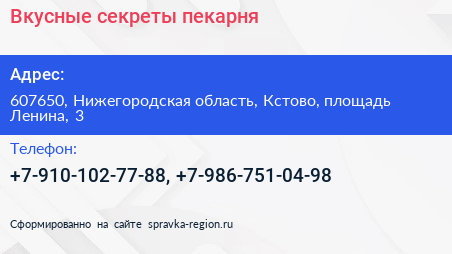 Вкусные секреты, пекарня по адресу 607650, Нижегородская область, Кстово, площадь Ленина, 3 в дальнейшем Организация, размещена в следующих категориях: