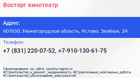 Восторг, кинотеатр по адресу 607650, Нижегородская область, Кстово, Зелёная, 24 в дальнейшем Организация, размещена в следующих категориях: