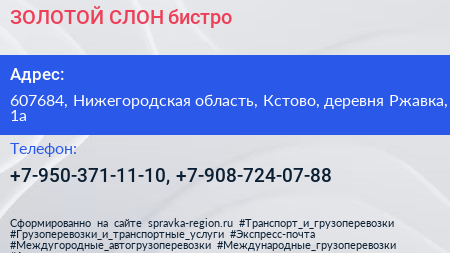 ЗОЛОТОЙ СЛОН, бистро по адресу 607684, Нижегородская область, Кстово, деревня Ржавка, 1а в дальнейшем Организация, размещена в следующих категориях: