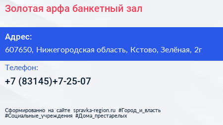 Золотая арфа, банкетный зал по адресу 607650, Нижегородская область, Кстово, Зелёная, 2г в дальнейшем Организация, размещена в следующих категориях: