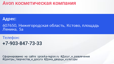 Avon, косметическая компания по адресу 607650, Нижегородская область, Кстово, площадь Ленина, 5а в дальнейшем Организация, размещена в следующих категориях: