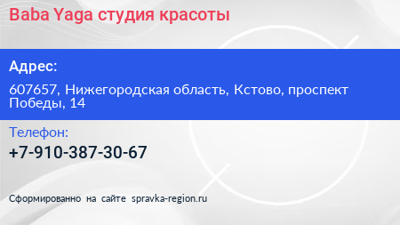 Baba Yaga, студия красоты по адресу 607657, Нижегородская область, Кстово, проспект Победы, 14 в дальнейшем Организация, размещена в следующих категориях: