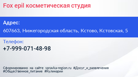 Fox-epil, косметическая студия по адресу 607663, Нижегородская область, Кстово, Кстовская, 5 в дальнейшем Организация, размещена в следующих категориях: