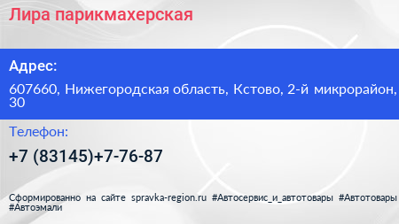 Лира, парикмахерская по адресу 607660, Нижегородская область, Кстово, 2-й микрорайон, 30 в дальнейшем Организация, размещена в следующих категориях: