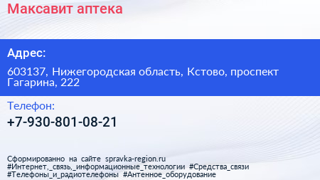 Максавит, аптека по адресу 603137, Нижегородская область, Кстово, проспект Гагарина, 222 в дальнейшем Организация, размещена в следующих категориях: