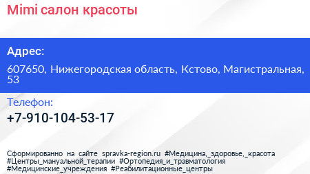 Mimi, салон красоты по адресу 607650, Нижегородская область, Кстово, Магистральная, 53 в дальнейшем Организация, размещена в следующих категориях: