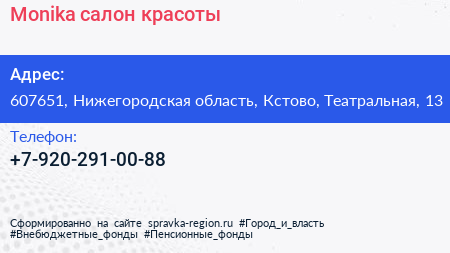Monika, салон красоты по адресу 607651, Нижегородская область, Кстово, Театральная, 13 в дальнейшем Организация, размещена в следующих категориях:
