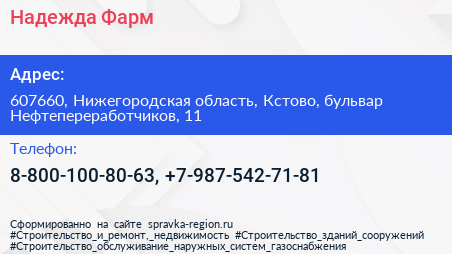Надежда-Фарм по адресу 607660, Нижегородская область, Кстово, бульвар Нефтепереработчиков, 11 в дальнейшем Организация, размещена в следующих категориях: