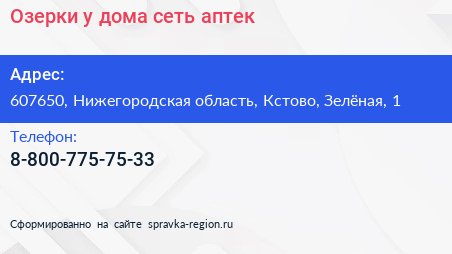 Озерки у дома, сеть аптек по адресу 607650, Нижегородская область, Кстово, Зелёная, 1 в дальнейшем Организация, размещена в следующих категориях: