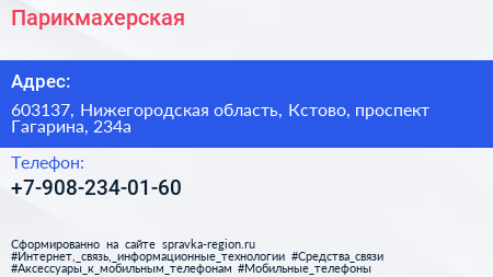 Парикмахерская по адресу 603137, Нижегородская область, Кстово, проспект Гагарина, 234а в дальнейшем Организация, размещена в следующих категориях: