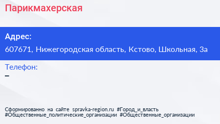 Парикмахерская по адресу 607671, Нижегородская область, Кстово, Школьная, 3а в дальнейшем Организация, размещена в следующих категориях: