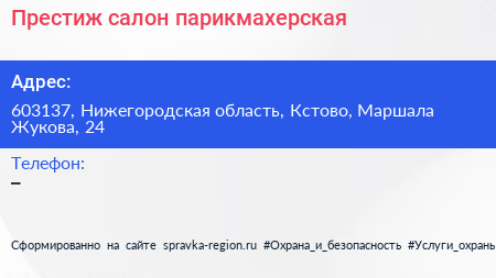 Престиж, салон-парикмахерская по адресу 603137, Нижегородская область, Кстово, Маршала Жукова, 24 в дальнейшем Организация, размещена в следующих категориях: