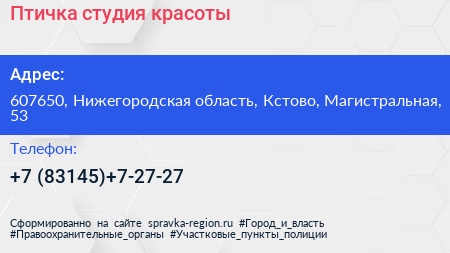 Птичка, студия красоты по адресу 607650, Нижегородская область, Кстово, Магистральная, 53 в дальнейшем Организация, размещена в следующих категориях: