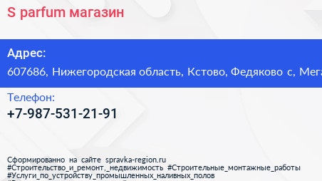 S parfum, магазин по адресу 607686, Нижегородская область, Кстово, Федяково с, Мега в дальнейшем Организация, размещена в следующих категориях: