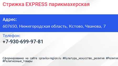 Стрижка EXPRESS, парикмахерская по адресу 607650, Нижегородская область, Кстово, Чванова, 7 в дальнейшем Организация, размещена в следующих категориях: