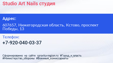 Studio Art Nails, студия по адресу 607657, Нижегородская область, Кстово, проспект Победы, 13 в дальнейшем Организация, размещена в следующих категориях: