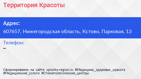 Территория Красоты по адресу 607657, Нижегородская область, Кстово, Парковая, 13 в дальнейшем Организация, размещена в следующих категориях: