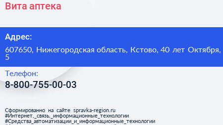 Вита, аптека по адресу 607650, Нижегородская область, Кстово, 40 лет Октября, 5 в дальнейшем Организация, размещена в следующих категориях: