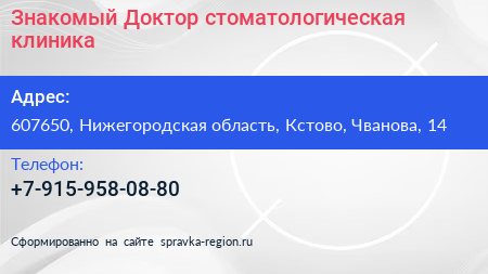 Знакомый Доктор, стоматологическая клиника по адресу 607650, Нижегородская область, Кстово, Чванова, 14 в дальнейшем Организация, размещена в следующих категориях: