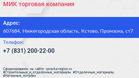 МИК, торговая компания по адресу 607684, Нижегородская область, Кстово, Промзона, ст7 в дальнейшем Организация, размещена в следующих категориях: