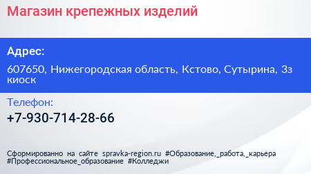 Магазин крепежных изделий по адресу 607650, Нижегородская область, Кстово, Сутырина, 3з киоск в дальнейшем Организация, размещена в следующих категориях: