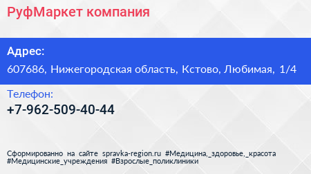 РуфМаркет, компания по адресу 607686, Нижегородская область, Кстово, Любимая, 1/4 в дальнейшем Организация, размещена в следующих категориях: