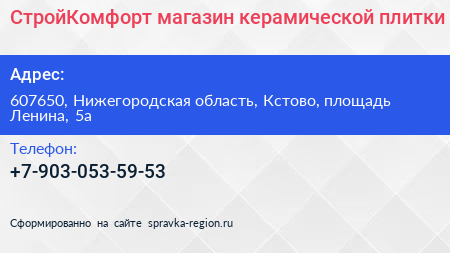 СтройКомфорт, магазин керамической плитки по адресу 607650, Нижегородская область, Кстово, площадь Ленина, 5а в дальнейшем Организация, размещена в следующих категориях:
