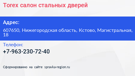 Torex, салон стальных дверей по адресу 607650, Нижегородская область, Кстово, Магистральная, 18 в дальнейшем Организация, размещена в следующих категориях: