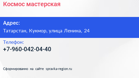 Космос, мастерская по адресу Татарстан, Кукмор, улица Ленина, 24 в дальнейшем Организация, размещена в следующих категориях: