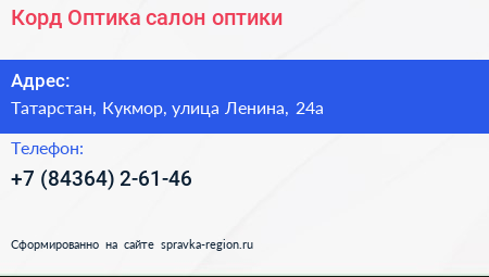 Корд Оптика, салон оптики по адресу Татарстан, Кукмор, улица Ленина, 24а в дальнейшем Организация, размещена в следующих категориях: