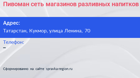 Пивоман, сеть магазинов разливных напитков по адресу Татарстан, Кукмор, улица Ленина, 70 в дальнейшем Организация, размещена в следующих категориях: