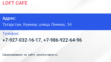 LOFT CAFE по адресу Татарстан, Кукмор, улица Ленина, 14 в дальнейшем Организация, размещена в следующих категориях: