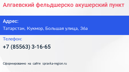 Алгаевский фельдшерско-акушерский пункт по адресу Татарстан, Кукмор, Большая улица, 36а в дальнейшем Организация, размещена в следующих категориях: