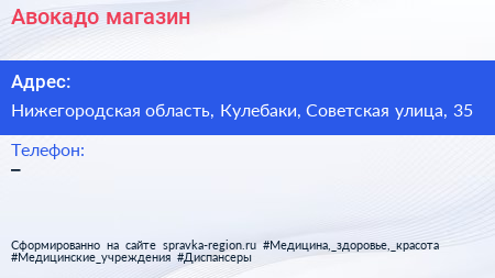Авокадо, магазин по адресу Нижегородская область, Кулебаки, Советская улица, 35 в дальнейшем Организация, размещена в следующих категориях: