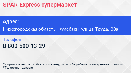 SPAR Express, супермаркет по адресу Нижегородская область, Кулебаки, улица Труда, 88а в дальнейшем Организация, размещена в следующих категориях: