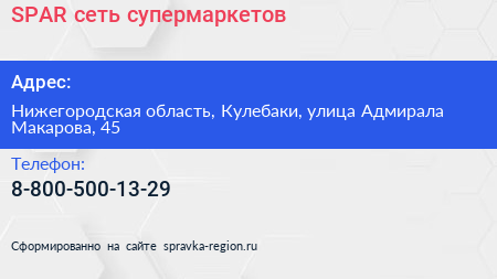 SPAR, сеть супермаркетов по адресу Нижегородская область, Кулебаки, улица Адмирала Макарова, 45 в дальнейшем Организация, размещена в следующих категориях: