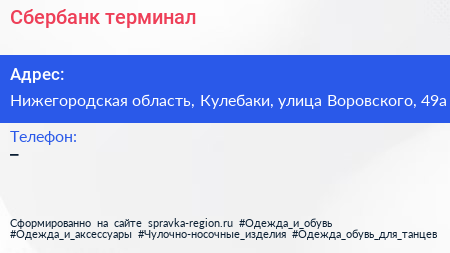Сбербанк, терминал по адресу Нижегородская область, Кулебаки, улица Воровского, 49а в дальнейшем Организация, размещена в следующих категориях: