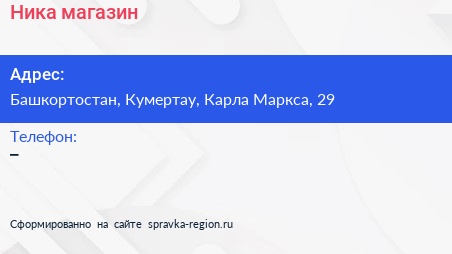 Ника, магазин по адресу Башкортостан, Кумертау, Карла Маркса, 29 в дальнейшем Организация, размещена в следующих категориях: