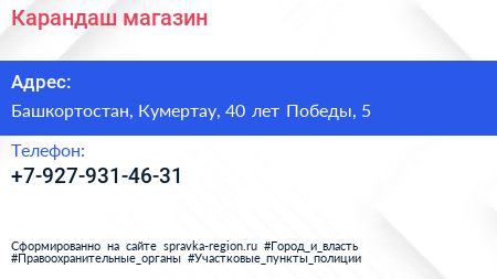 Карандаш, магазин по адресу Башкортостан, Кумертау, 40 лет Победы, 5 в дальнейшем Организация, размещена в следующих категориях: