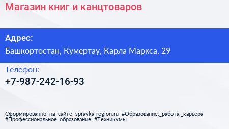 Магазин книг и канцтоваров по адресу Башкортостан, Кумертау, Карла Маркса, 29 в дальнейшем Организация, размещена в следующих категориях: