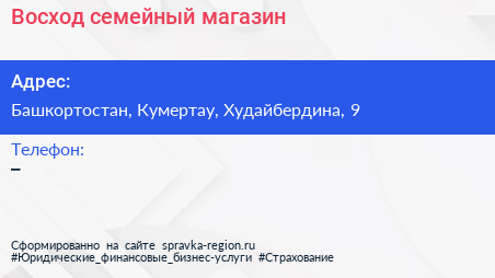 Восход, семейный магазин по адресу Башкортостан, Кумертау, Худайбердина, 9 в дальнейшем Организация, размещена в следующих категориях: